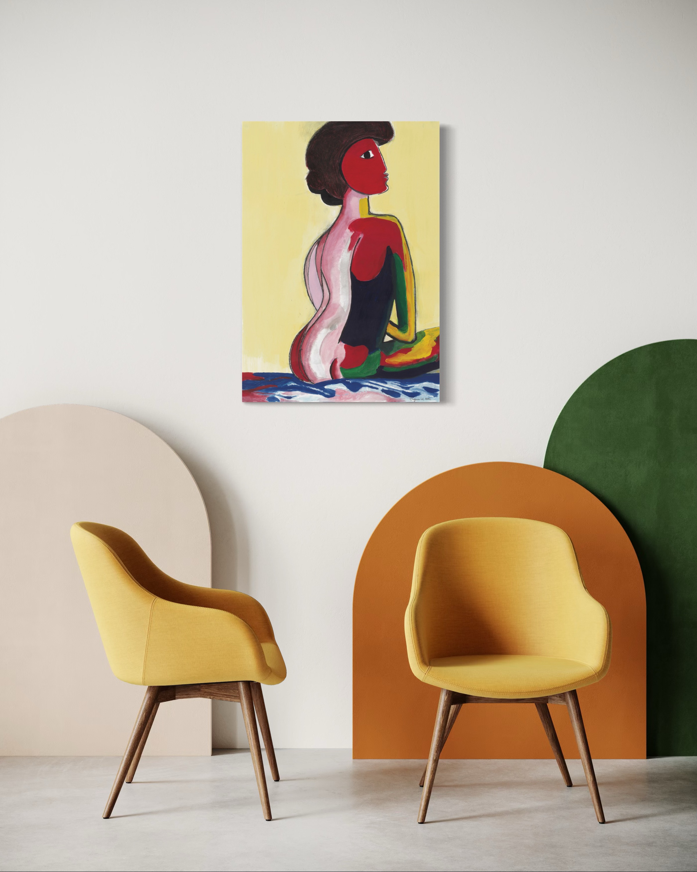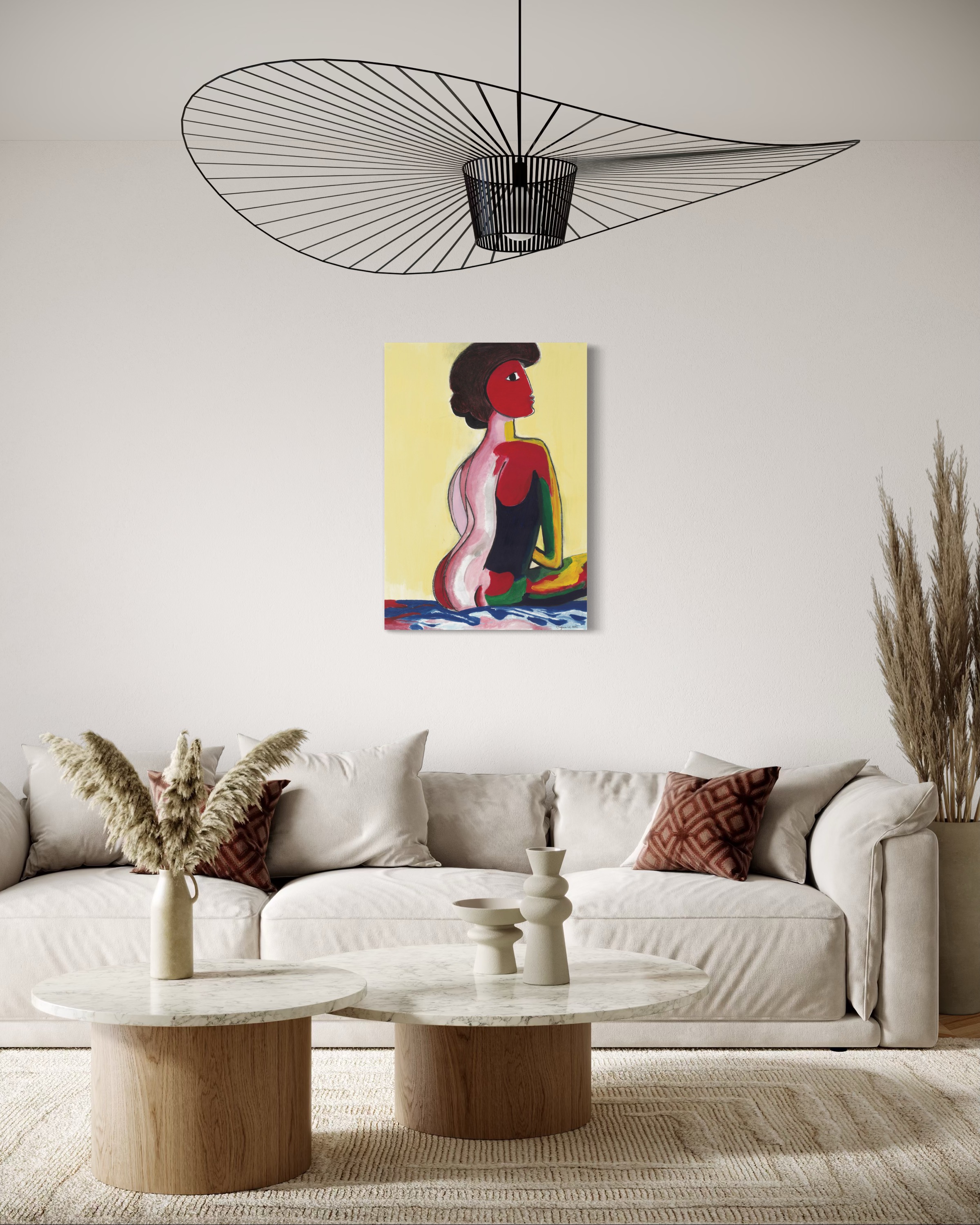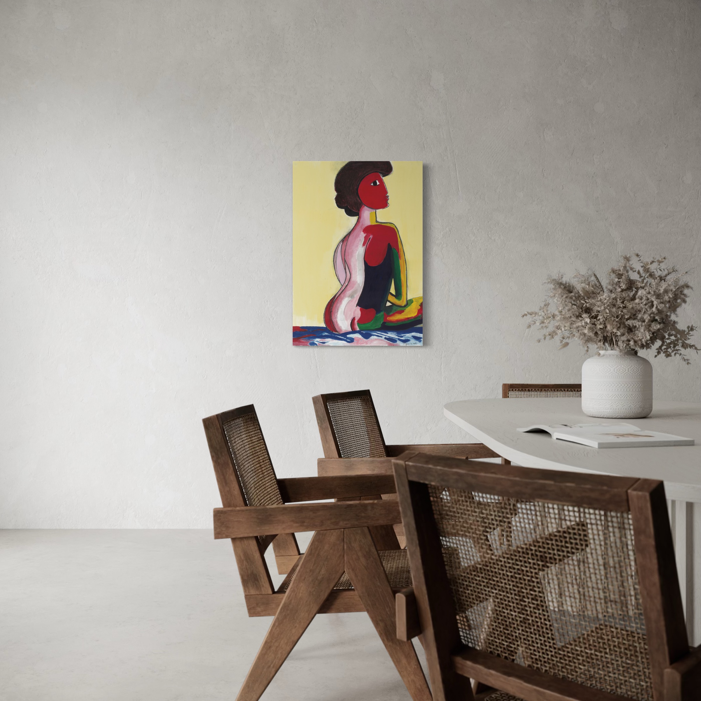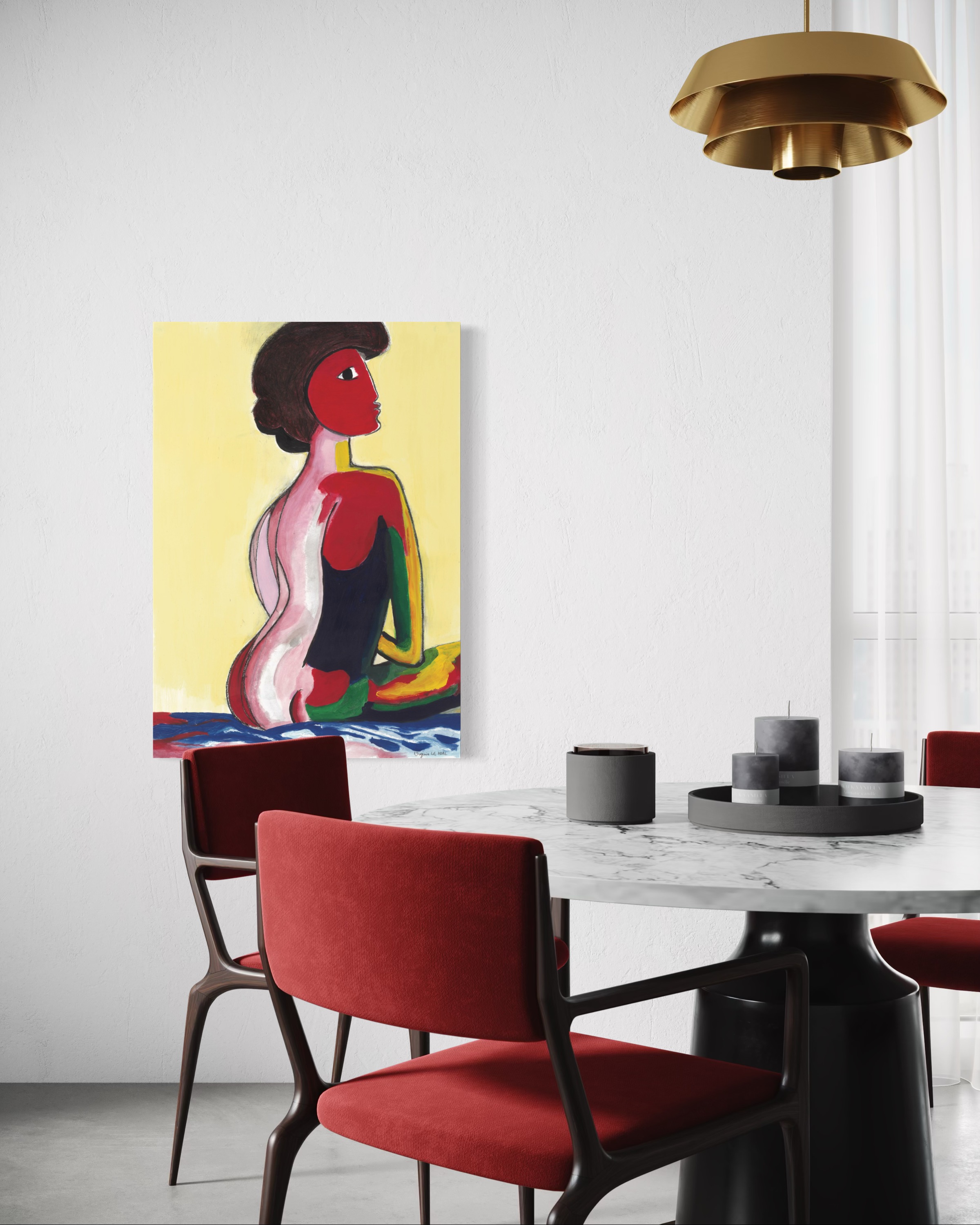 La Dame, avec ses couleurs vibrantes et ses formes expressives, incarne l’élégance, la force et le mystère. Son regard détourné et sa silhouette audacieusement fragmentée captivent, évoquant un équilibre subtil entre puissance et vulnérabilité.